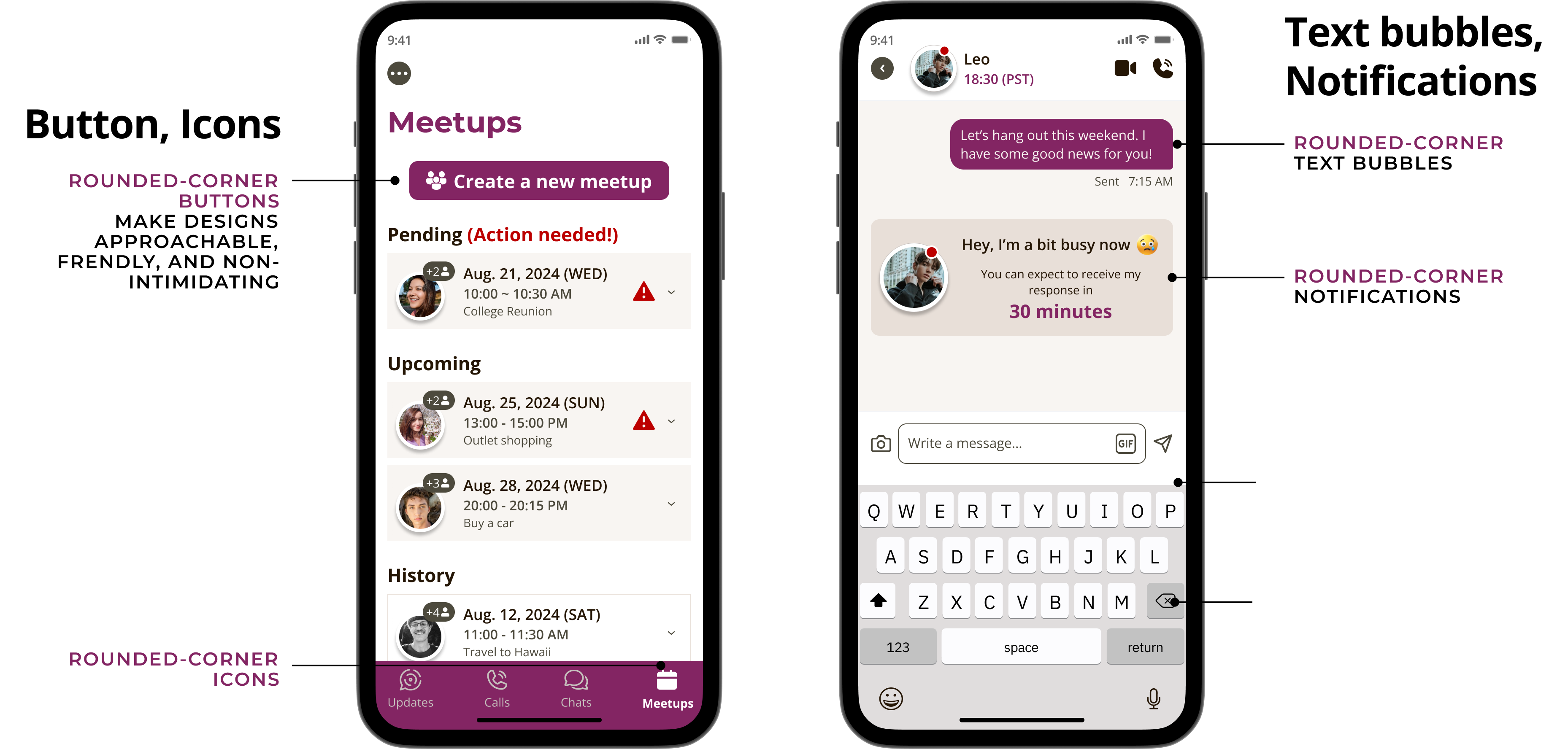 ICONS, BUTTONS, TEXT BUBBLES, NOTIFICATIONS: They all have rounded corners, which make the designs approachable, friendly, and non-intimidating.