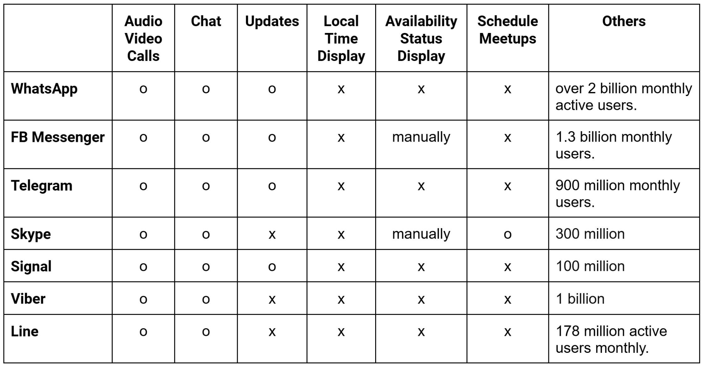 To better understand how comparable messaging apps have tried to help users connect across time zones, I conducted a Competitor Analysis on the most popular messaging apps. While WhatsApp displays the ‘last seen’ local time, none of the messaging apps provides optimal solutions for time zone difference issues,such as time zone confusion or cross-time-zone meetup scheduling, which Maki and others have struggled.