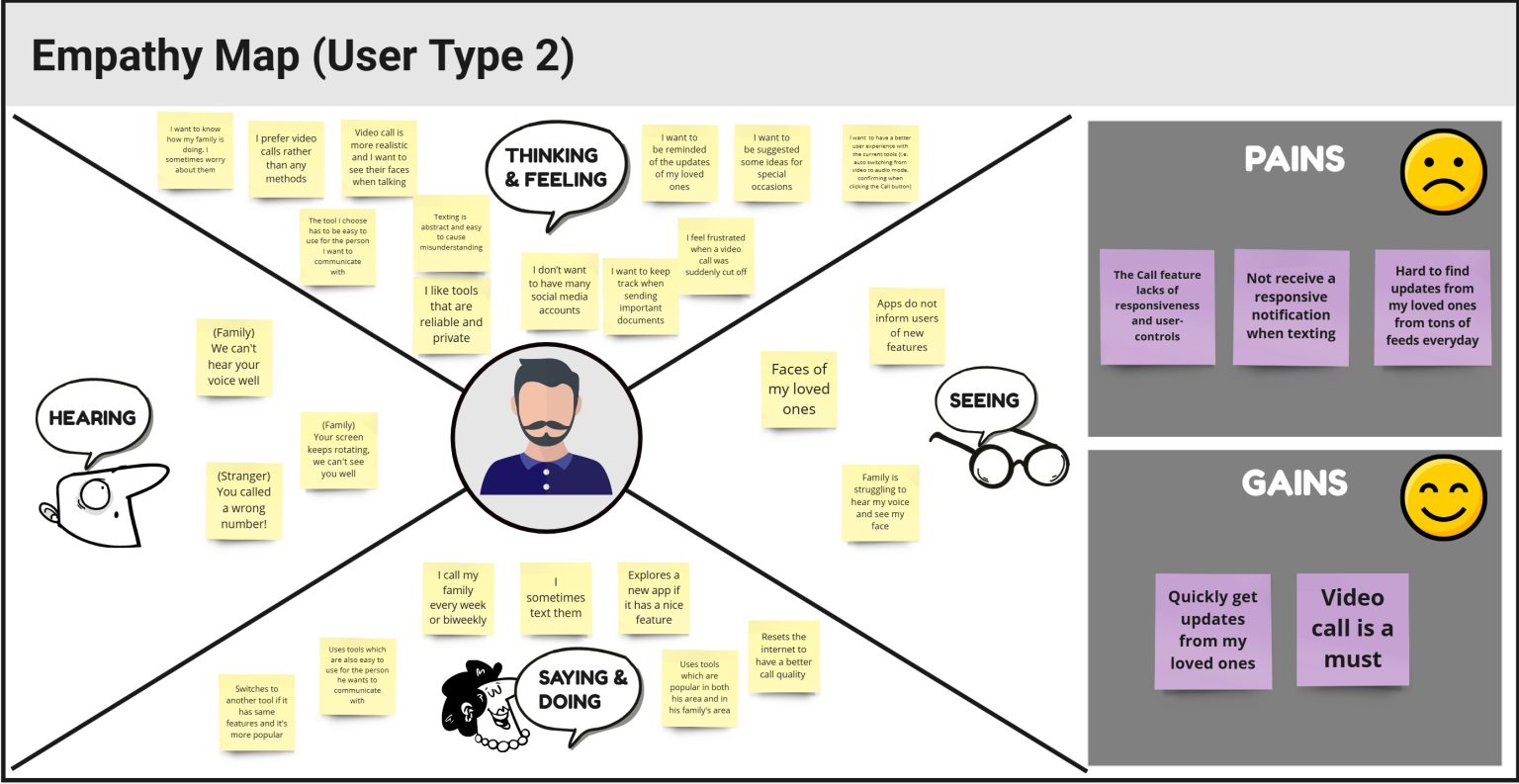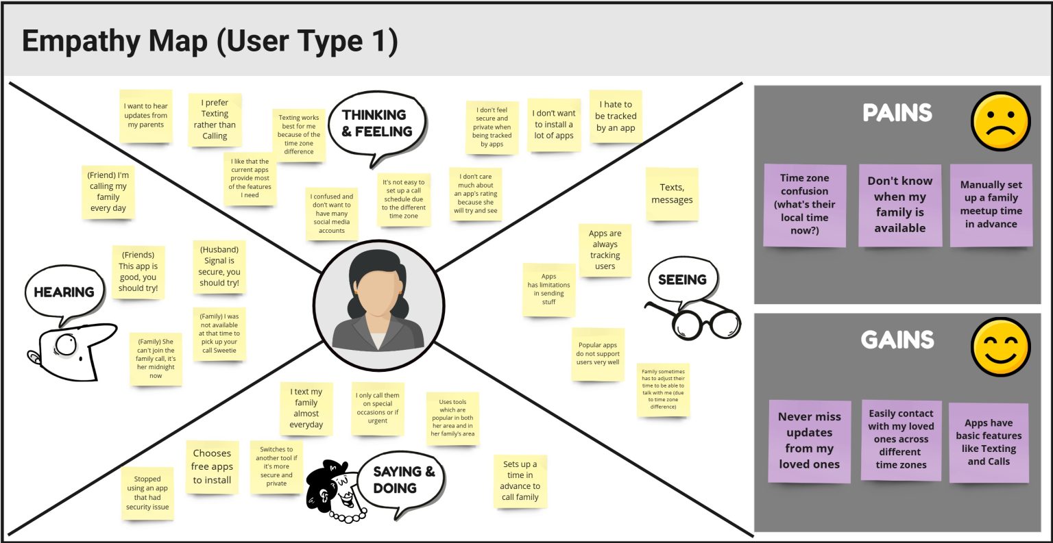 Via Affinity Mapping, I identified 2 user types who were suffering challenges from cross-time-zone communication, so I developed two Empathy Maps to gain a deeper understanding of the users’ environments and further connect with their feelings. This helped me identify the 3 major problems users were facing as mentioned below.
