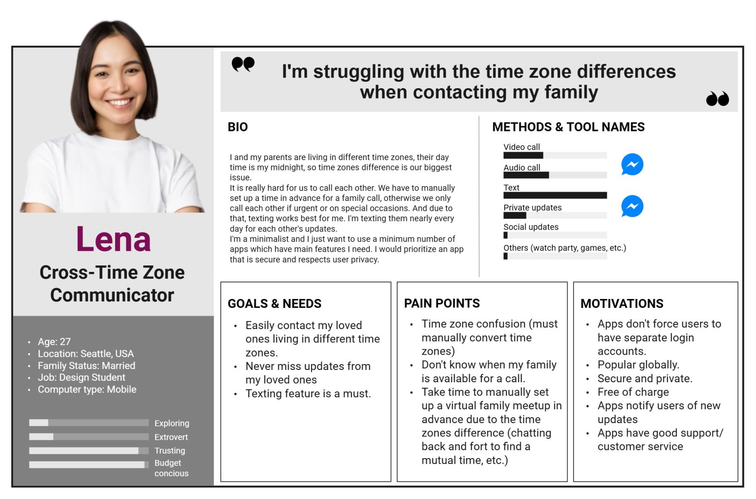 After creating a Research Plan that served as a roadmap for the process, I recruited relevant participants using Screener Surveys and conducted user interviews to uncover pain points and needs from real potential users. The results revealed a lack of cross-time-zone communication solutions in existing messaging apps, leading to challenges such as: