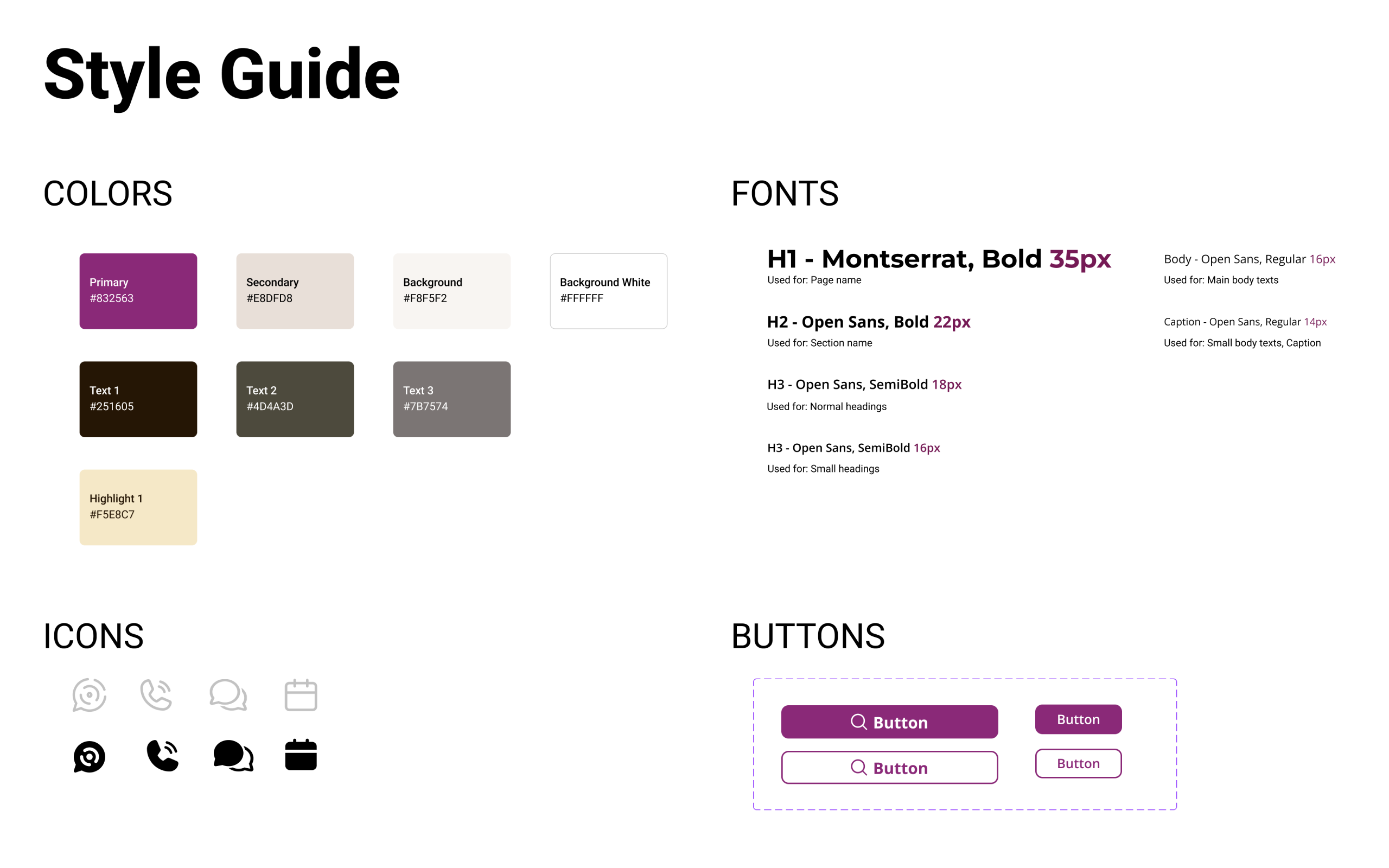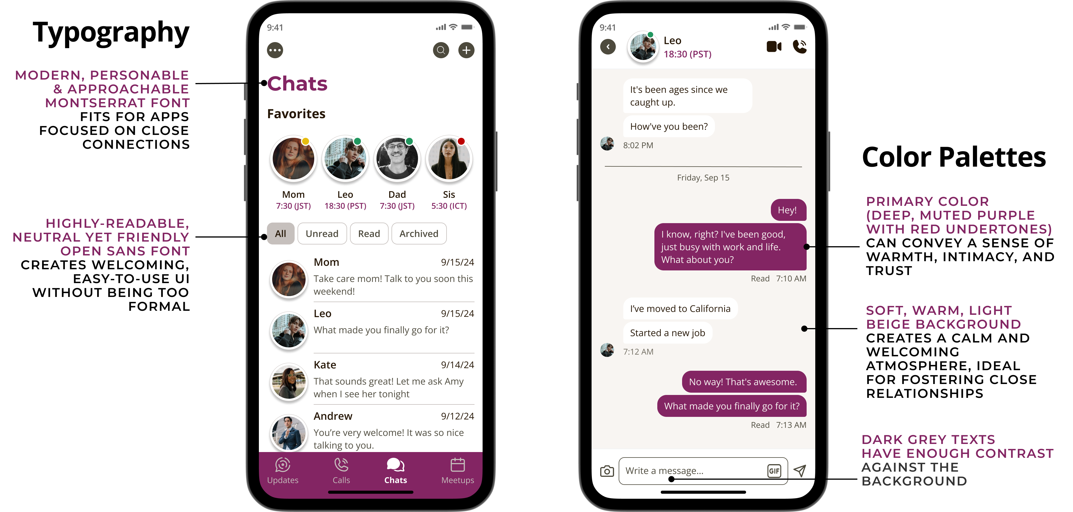 COLOR PALETTE: I considered color psychology to decide the primary color for the app. The Primary color is a deep, muted purple with red undertones, which can convey a sense of warmth and intimacy. Especially, the muted nature of this particular shade can enhance that feeling by being more subdued and less formal, while the richness of this shade can also evoke a sense of trust and reliability. It is paired with a soft, warm light beige background which helps enhance the feelings of warmth & trust. The light tone of the background creates a calm and welcoming atmosphere, which is ideal for fostering close relationships with family/ friends. Dark grey shades are used for Texts. The texts were tested and it showed that they passed the WCAG requirements at both AA and AAA levels, meaning they have enough contrast against the backgrounds for readability and accessibility.