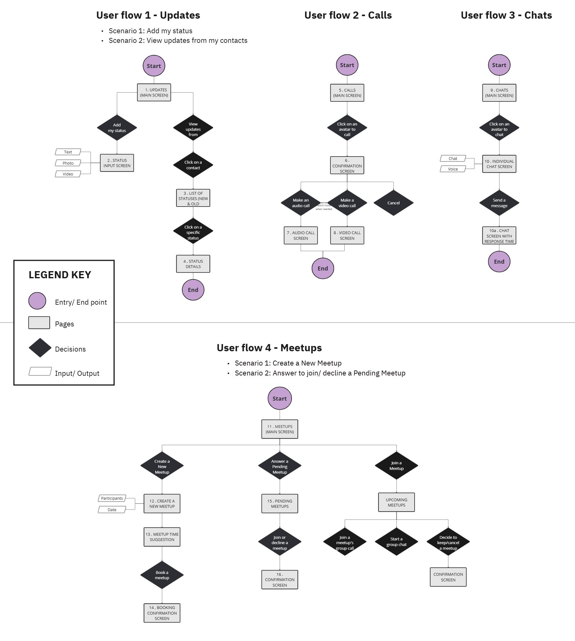 I then developed the key user flows, illustrating step-by-step how users navigate the red routes—the primary actions essential to the core experience.