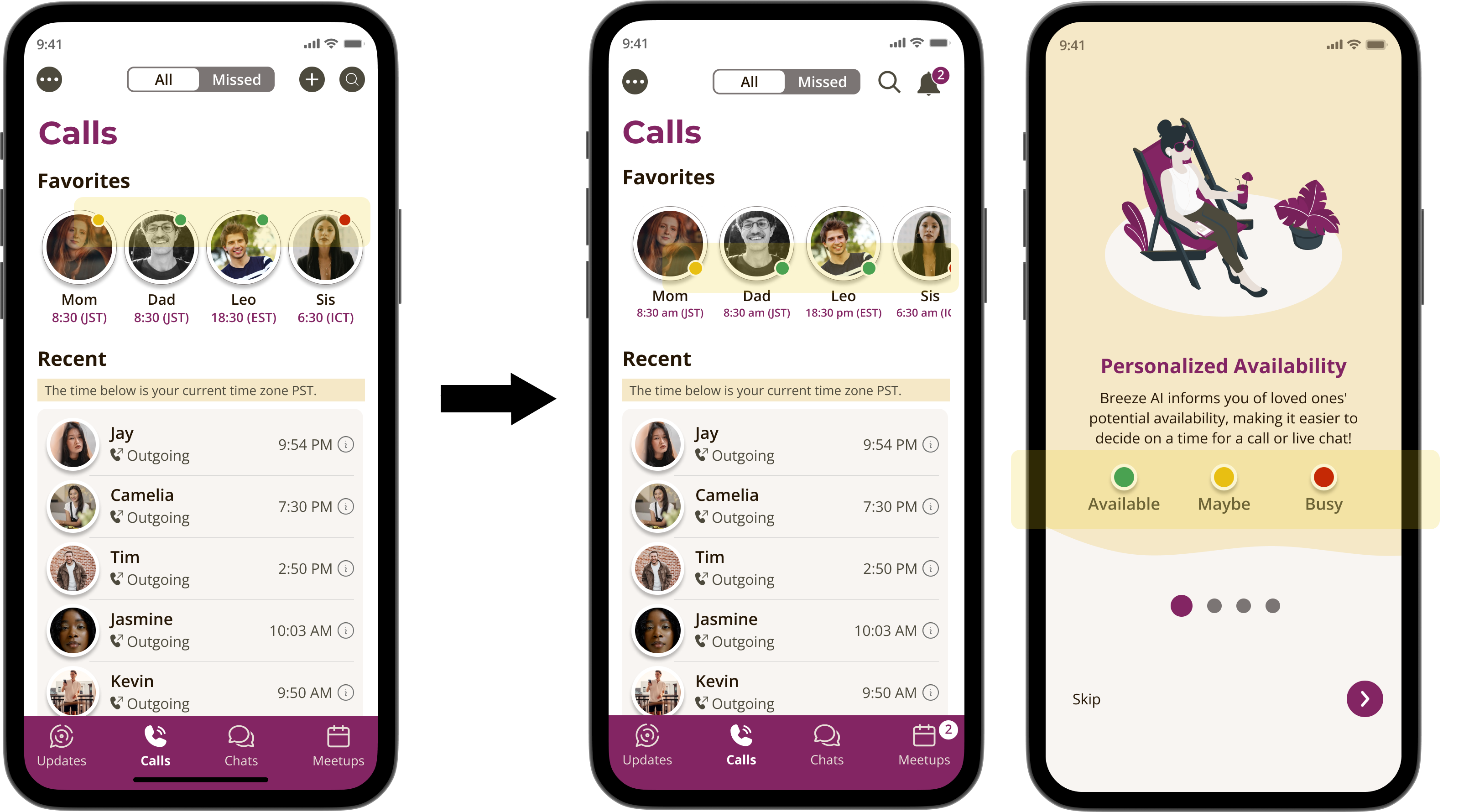 Displaying local times and personalized availability in key areas throughout the app (i.e., Calls and Chats).