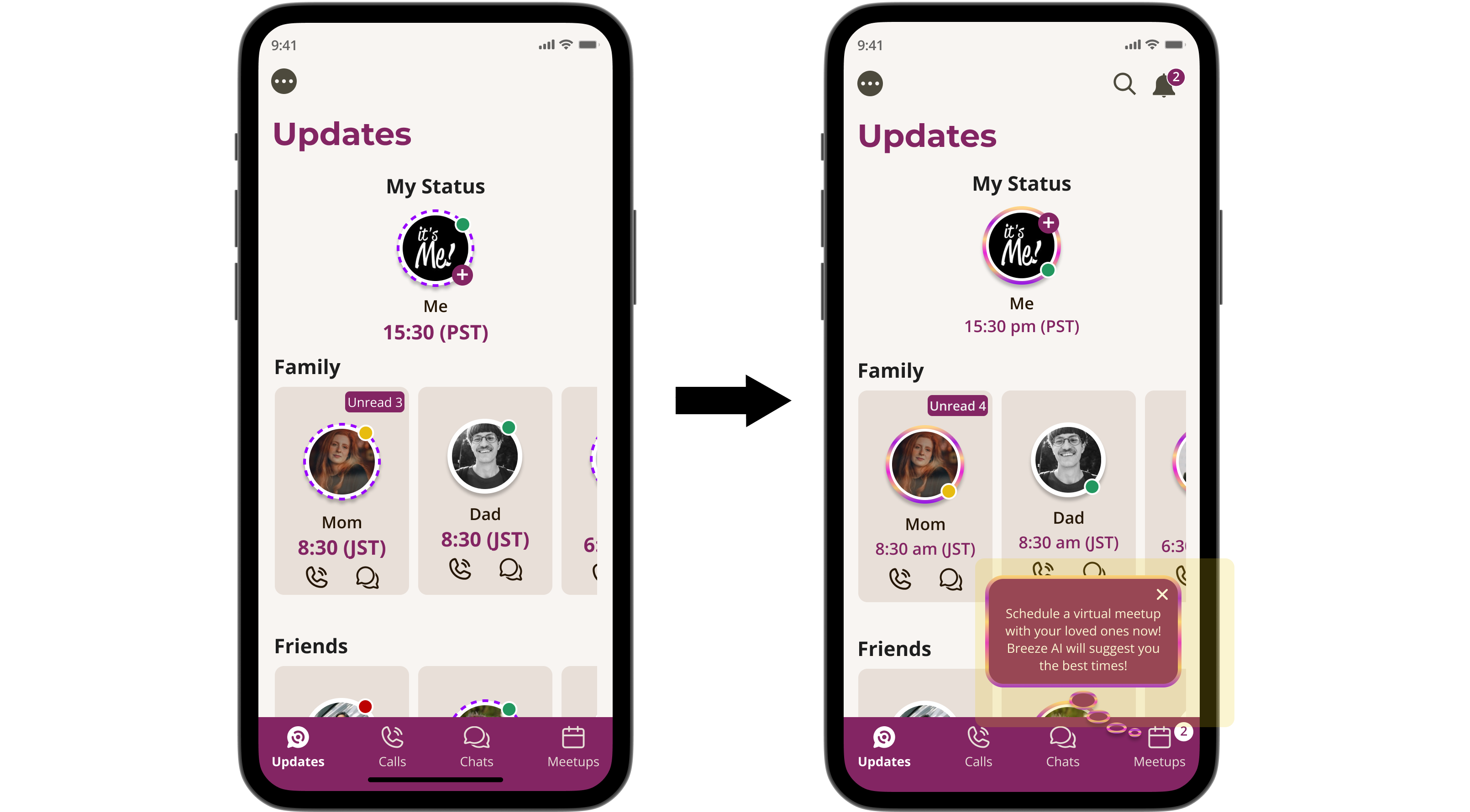 Solution: I designed the new AI-powered “Meetups” feature, enabling users to schedule cross-time-zone gatherings in just a few clicks. By automating availability detection and time zone coordination, this feature helped users connect with loved ones 50% faster.