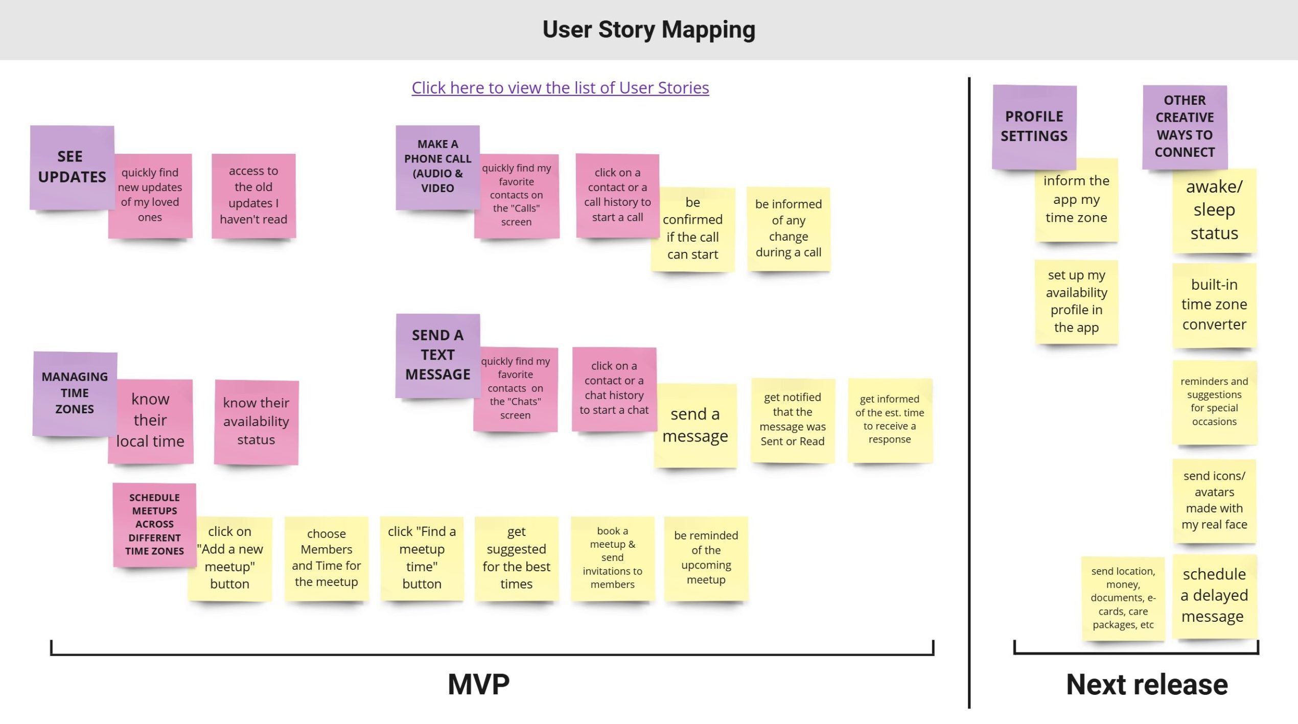 To address the 3 most pressing user pain points uncovered in research, I framed the MVP around time-zone clarity, scheduling ease, and responsive communication. I generated user stories that captured how people would interact with the app, then prioritized the most impactful stories based on user needs and feasibility, which shaped the MVP scope. The final MVP focused on four key feature areas: Updates, Calls, Chats, and Meetups—each mapped directly to a core pain point.