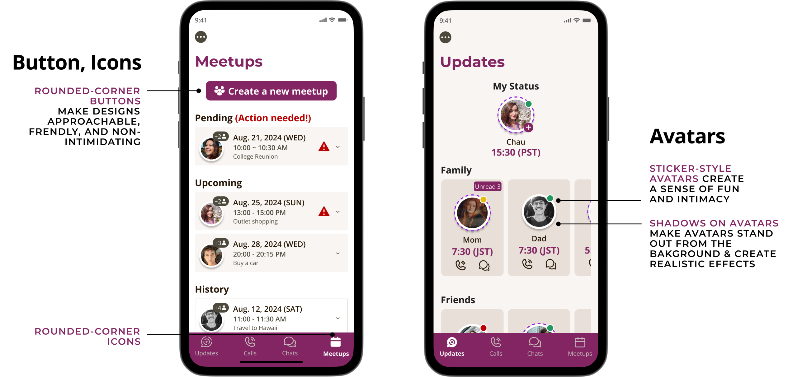 IMAGES: For messaging apps, there are not many images like other types of apps, the only images are the user avatars. I used sticker style for the avatars to create some sense of fun, informality, and closeness, helping users feel comfortable for casual chats with family & friends. I also use shadows on avatars, making them stand out from the background, to create more realistic effects and make them less formal.